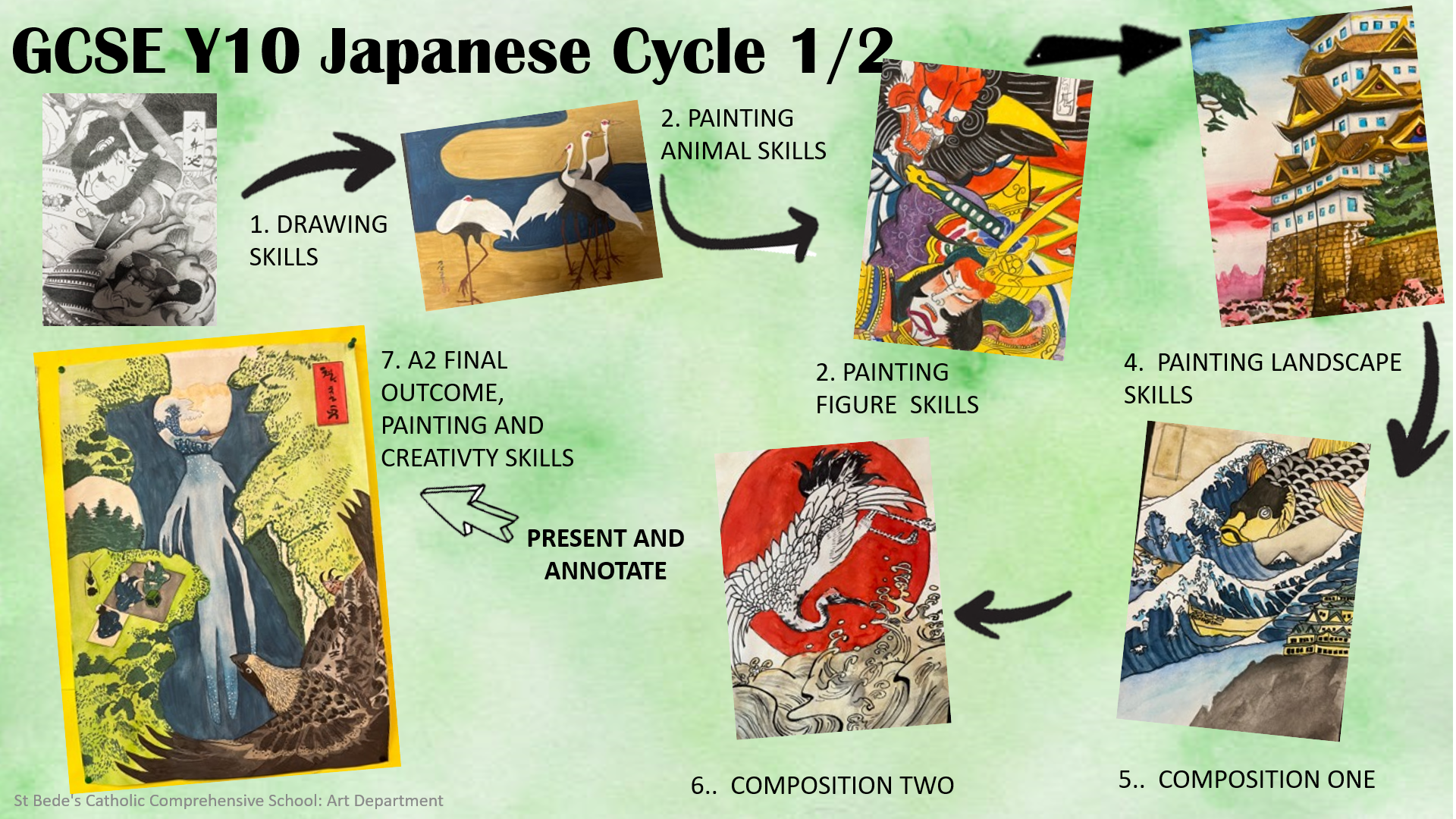 All pupils explore different approaches to Japanese Art. They develop skills and knowledge of Japanese design and research how their art style has developed from the East and West. Students produce a series of paintings influenced by Japanese Edo Kite designs. This challenged their KS4 knowledge and students then develop their observational drawing skills from secondary and primary sources. Students explore media and materials whilst learning about colour, texture, composition, and scale.